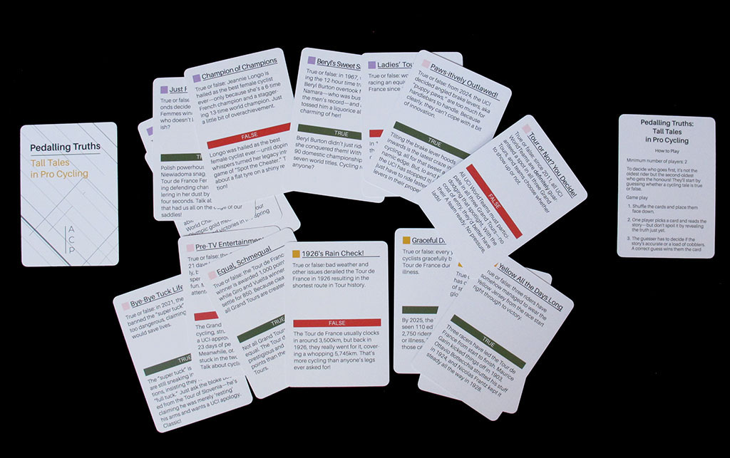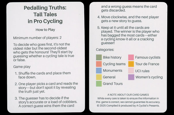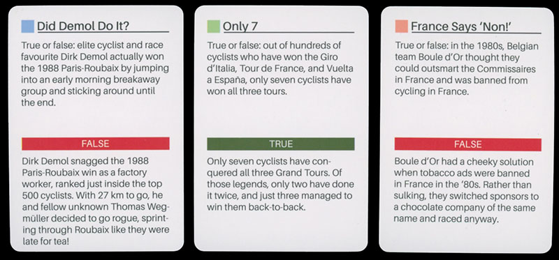 The game features 52 cards with facts that may be either true or false, belonging to seven categories: bike history, cycling teams, monuments, grand tours, famous cyclists, Tour de France, UCI rules, women's cycling, and "general".