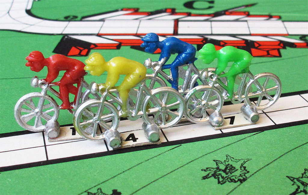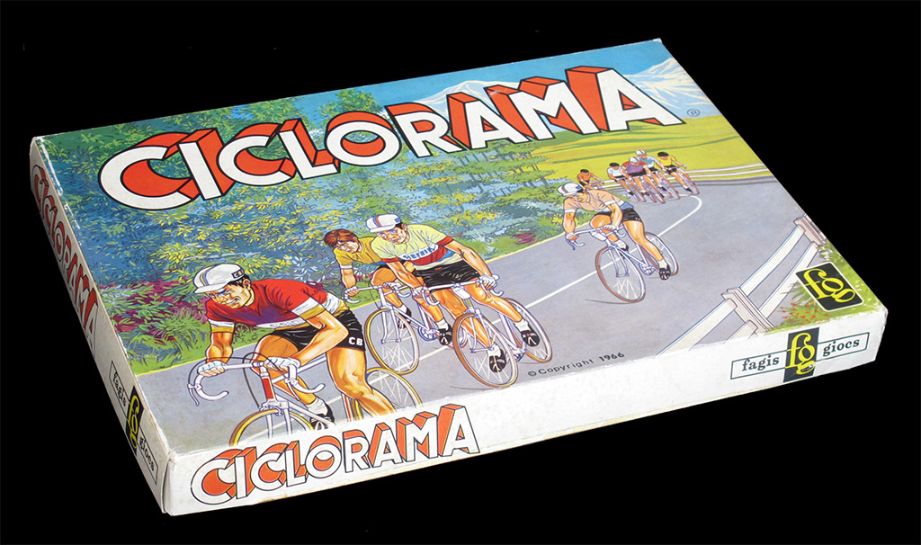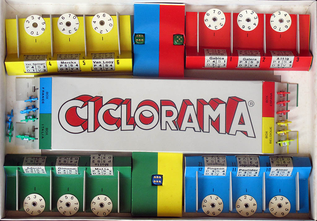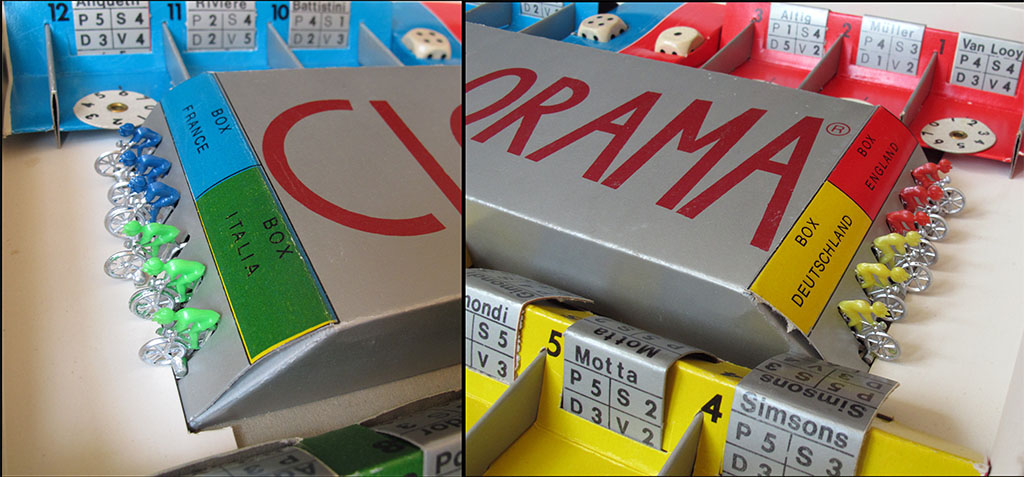 While the four teams in the "Facis" box are Italy, France, Belgium, and Spain, in the "Giochi simulatori" box Spain has been replaced by Germany. However, players can choose the cyclists on their teams regardless of the riders' nationalities. The Facis game features three French, Belgian, and Italian riders, as would be expected, but only two Spaniards and then a German, Rudi Altig, to complete the team. The "giochi simillatori" box, on the other hand, features five Italian riders, three French, two (?) Germans, one Belgian, and one Briton (assuming "Simsons" to be Tom Simpson).