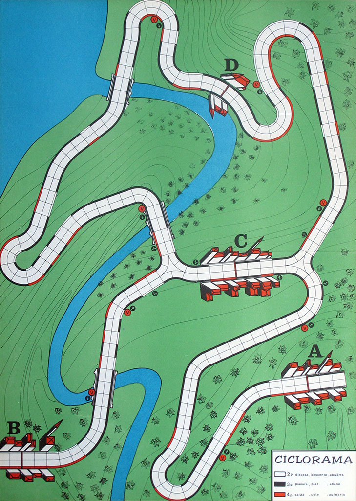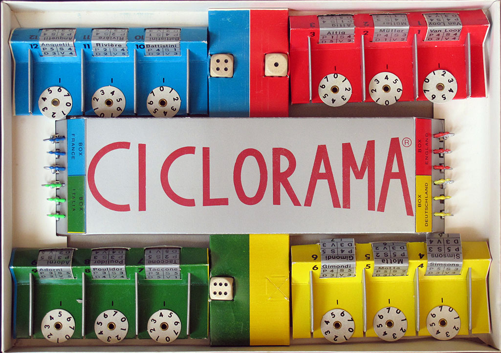 The rules of Ciclorama are trilingual (Italian, French and German). I would generally assume that, the game being Italian, in case of doubt the Italian rules should be the original ones. However, in the case of this game I am not sure, since there are some inconsistencies in the Italian rules (see below). The problems are is that the French translation is also problematic (it is clearly a translation, the idioms are sometimes wrong, and it mentions a "course contre la montre", which is clearly a mistranslation) and that my knowledge of German is not good enough to determine if the rules look like they could have been written in German first.