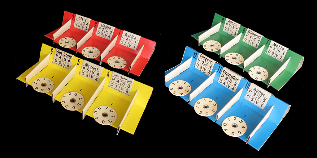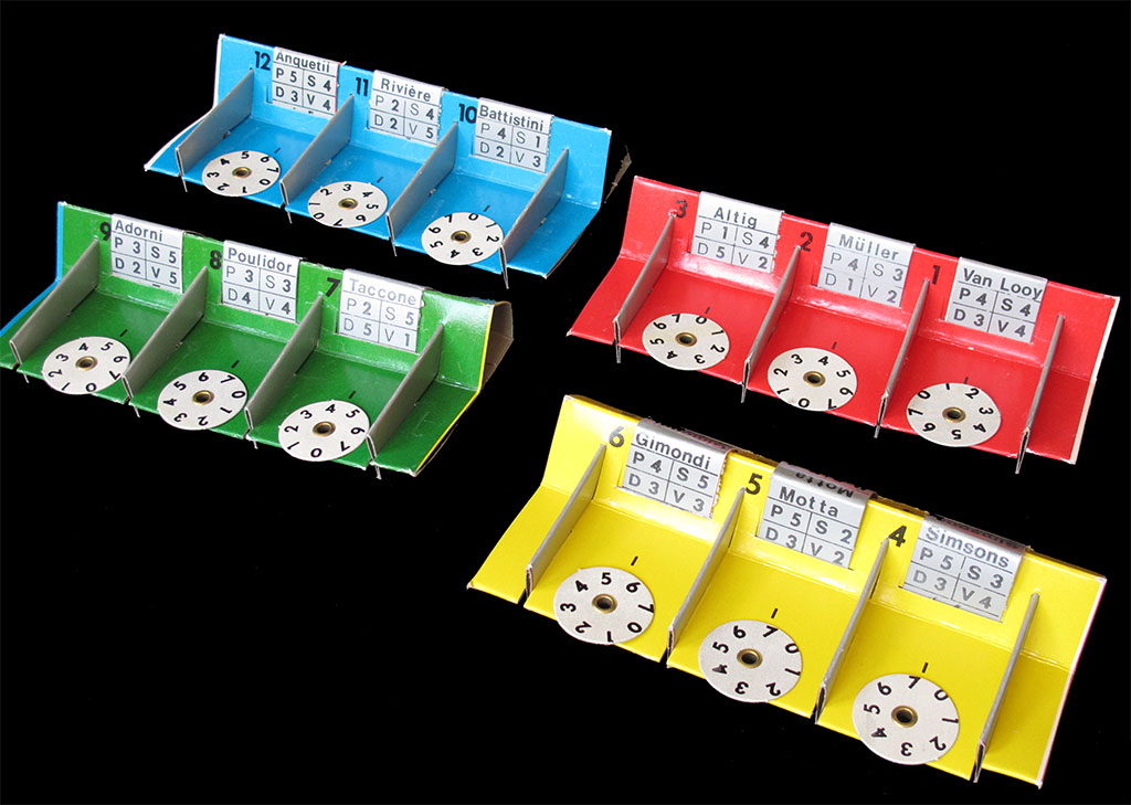 Each team consists of three riders. Each of these riders has different abilities. According to the Italian rules, riders' abilities are P=Pianura (flat road), S=Salita (climb), D=Discesa (descent), and V=fondo (endurance). Of course, V for "fondo" is a weird choice, especially if you compare it to the French and German rules, which have 5 different values for each rider. By a design feature, the fifth ability is hidden from sight. Check, for instance, Motta in the first picture below (or Gimondi and "Simsons" in the second), and you will discover the fifth value below the others. So, as correctly stated in the French and German rules, V is for sprint ("Velocità"), and "f" is for "fondo" (endurance). The "f" value marks the wheel position at the beginning of the race. If your rider has f=6, the race will start with the wheel at 6. This value decreases during the race.