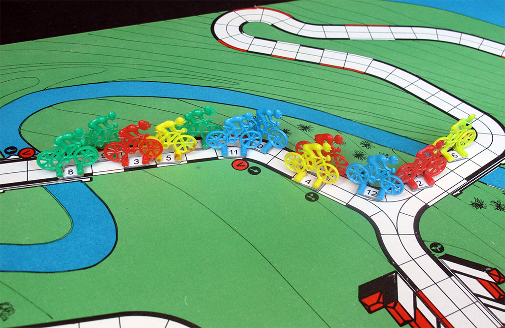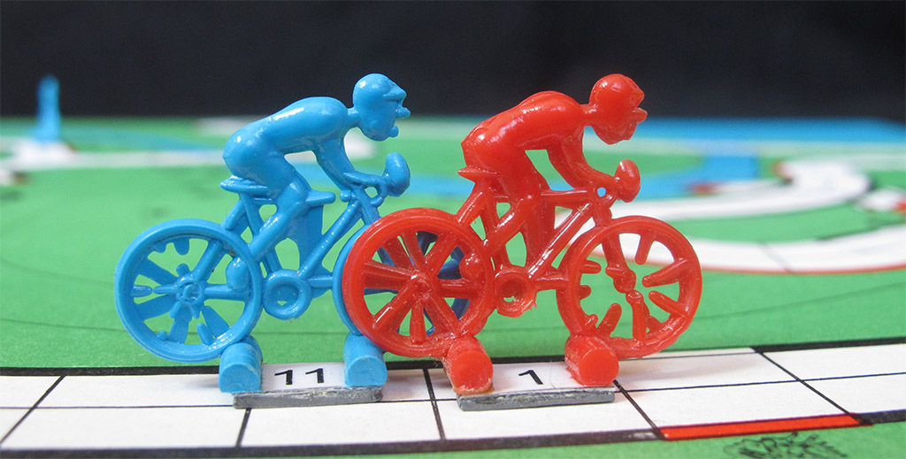 The rider abilities are added to the value thrown with the dice depending on the type of terrain. Some extra points are also added to the throw if the rider is protected from the wind (behind another rider). But this total sum is not the value by which the riders move, since different types of terrain need different values to move through them. You need two points to move a square on descents, three on flats and four on climbs. The possible remaining points are discarded.
