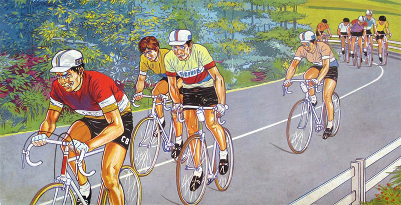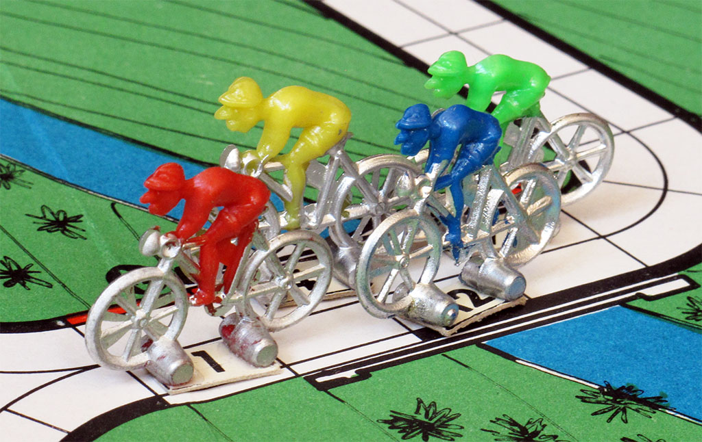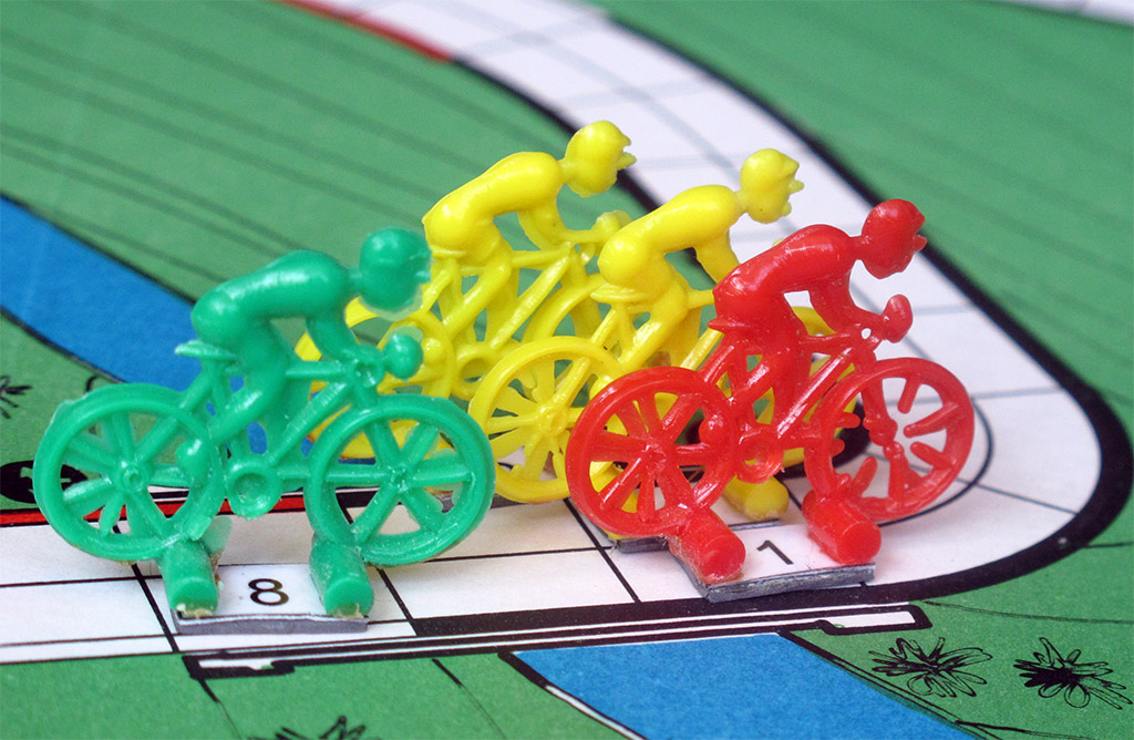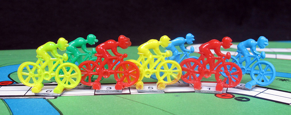 Whatever the original language, the rules are those of what I call "an ambitious game", one that wants to represent as many aspects of cycling races as possible. We find different types of terrains, and each rider has different abilities. The game is meant to represent a stage race, with classification by time and/or points, but it also can be used to play a single one-day race.