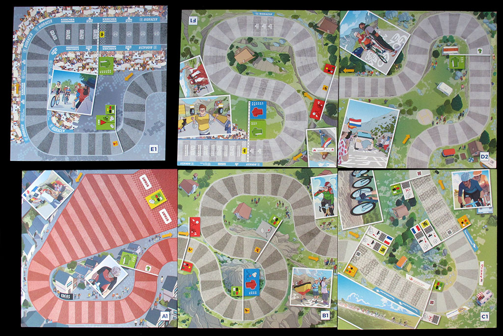 In the new version we have one extra board for more variation. Though races will use between three and five boards, now we can choose between 12 different sides. Of course we need a start and a finish, but there are many options in between. Furthermore, some road segments have different rules depending on the type of race. For instance, we have different cobblestone rules depending on if it is a French classic or a Belgian classic.