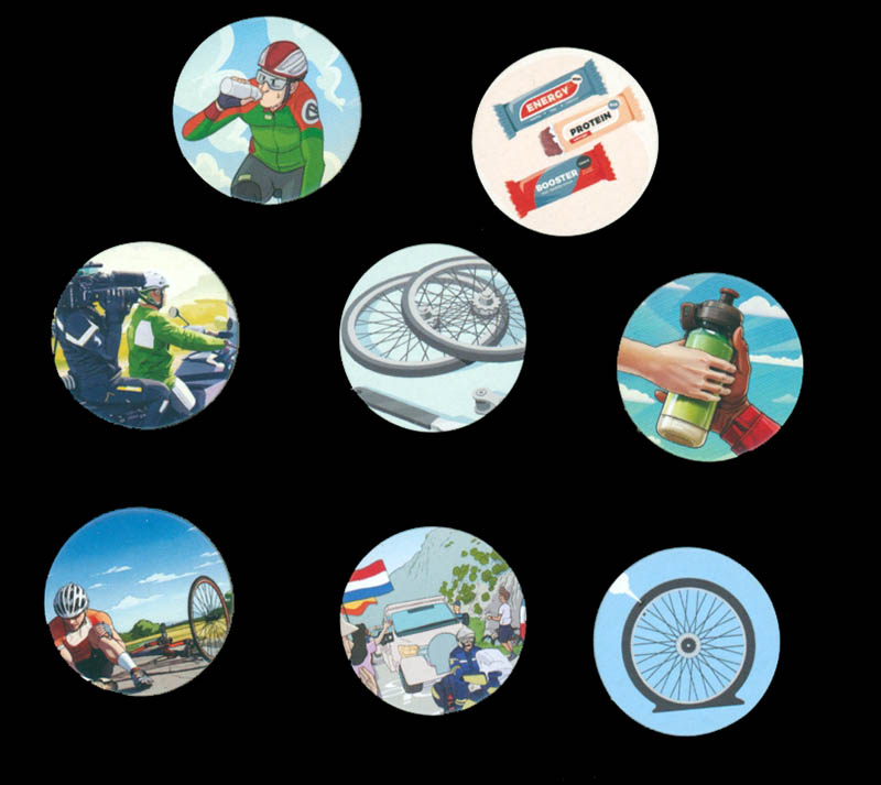 On the other hand, one-day classic races have been enriched with event tokens which are distributed to the players (one each) at the beginning of the game and kept secret until they are needed. Each one has a different use, from the simple flat tire ("miss a turn", to be played on a rival), to some that may not be the best example for the young ("bidon collé", two extra squares forward; "on the wake of the TV motorcycle", four extra squares forward).