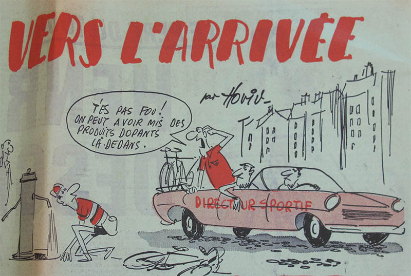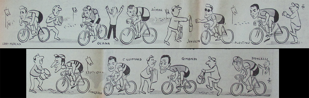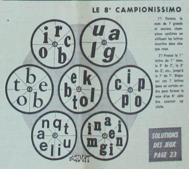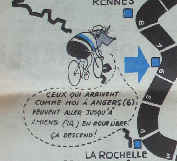 This game was included in a Tour de France special issue of the weekly humour magazine Le Hérisson in 1970. Le Herisson ("The Hedgehog") was founded in 1936 and lasted, with different changes in format and even in name, until 1997. In 2015 the magazine was revived, though in electronic format only. When this game was published, the magazine was quite big (60 x 42 cm), and it was printed on green paper. Rest assured, there is nothing wrong with your screen's colour calibration. The pictures are actually greenish.