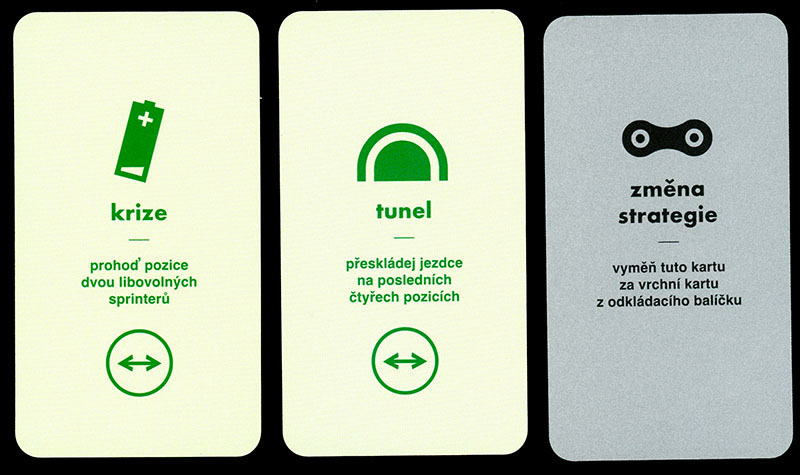 The new edition deck has 72 cards (instead of 68). Three white cards have been removed (one each of hills, mountains, and downhill), and seven new cards have been added: 3 krize, 2 tunnel, and 2 Změna Strategie cards. For those of you who do not speak Czech yet and/or are too lazy to use automatic translators, let me offer a little help:
