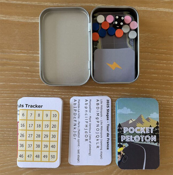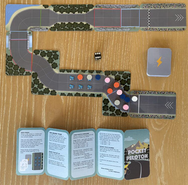 The game is a dice game where each player controls a team of two or three riders. Simple as they are, the rules take into account aspitration, climbs, descents, and even some energy management: there is a feed zone where riders can collect boost cards to be played later. The rules even offer the possibility to play a stage race (with a points classification). Not bad for such short, easy-to-read rules.