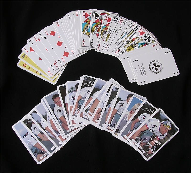 Most cycling teams issue series of postcards featuring each season riders. Since the sponsor of the FdJ team is related to games, one can expect some kind of game-related memorabilia. What we have here are two standard poker decks issued in 2002 and 2005, in which there are some extra cards featuring the FdJ riders. These cyclist cards are not used to play.