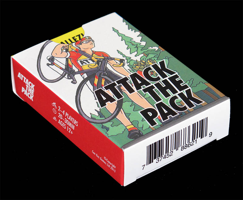 Here is a card game which represents a one-day cycling race and which has been successfully funded in a Kickstarter campaign. There are not so many card games that successfully represent a cycling race besides, of course, the quintessential Échappée (Der Ausreisser) and another recent game, First To The Line, with which this Attack The Pack one may have some slight passing resemblance at first sight.