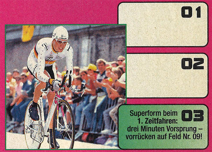 This is a game included in the number 15 of German sports magazine Bravo Sport, dated July 12th 2001. Bravo Sport was (and still is) is a German sports magazine for young people dedicated mainly to soccer, but of course in 2001 Jan Ullrich was one of the favourites for the Tour de France and therefore the sport had a burst of popularity in Germany.