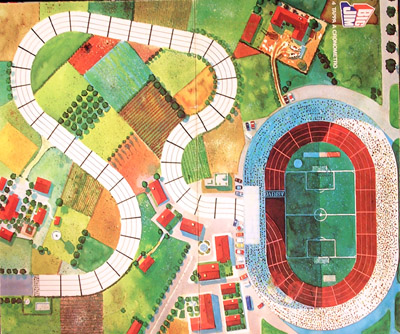 Big Jim is so strong he even takes part in the Giro! (This is how the rules of this game start). Leaving Big Jim aside, this is a nice game with two big two-sided boards, which makes 4 different tracks: 2 mountain stages, one time-trial (enĄding in a stadium) and a long flat stage (4th picture: notice the incredible design of that one: try to follow it!)