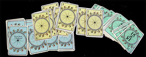 Blue cards are chance cards, yellow cards are booster cards (played instead of throwing the dice: any number of booster cards can be played at one time) while green cards are lap prices which can also be used as boosters. Very nice cards, by the way.