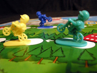Simba is an Italian maker, but my copy is definetely German. This quite unusual game represents a mountain bike race, in which teams of four riders struggle to reach the top.