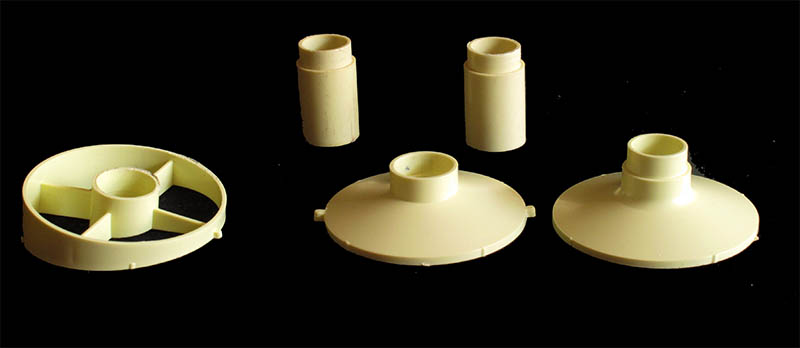 The game includes implements to build mountains and hills. Instead of having some kind of mark on the road or a different colour, we find here the supports you see above with which you can elevate the road. You can also cant the curves with them. The smaller road pieces are curved to make the transitions smooth. The piece on the left ins placed between the flat part of the road and the mountain, while a couple of pieces like the one on the right make the mountain (or hill) top. There are four of each of these pieces in the box.