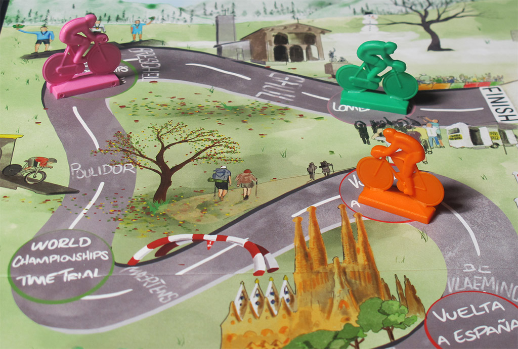 The open board measures 48x48 cm and represents a cycling season. The races are ordered chronologically, according to their order in the cycling calendar, and when two races are simultaneous (for instance, Paris-Nice and Tirreno-Adriatico) there are two paths that you can choose. On the other hand, the three-week tours have three fields each.