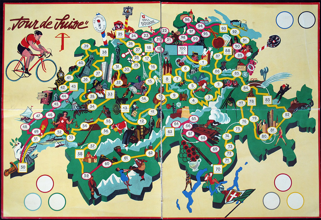 This old Swiss game has proven to be hard to find. It was first mentioned to me almost fifteen years ago by the late Geert Lagrou, who sent me a picture of the game he had found in a book (see below). In these years I have seen the game for sale only a couple of times, until I was lucky enough to stumble on a copy of the game. That was the box you can see on the left of the picture above, and I guess we can call it the poor man's version of the game. And then, just a few months later, I received an email asking if I was interested in buying the box you see on the right, complete with metal riders. Of course I was!