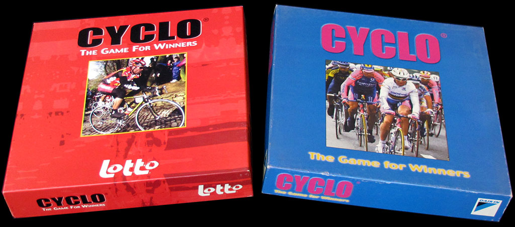 This is a game with a long story (part of which is explained in the MAKING CYCLING GAMES section). The game originated in the 1960s in the Donvil family, was further developed by Dirk Donvil, and was finally published as a promotional item for Daikin (red box) in 1999 and for Lotto (blue box) in 2002.