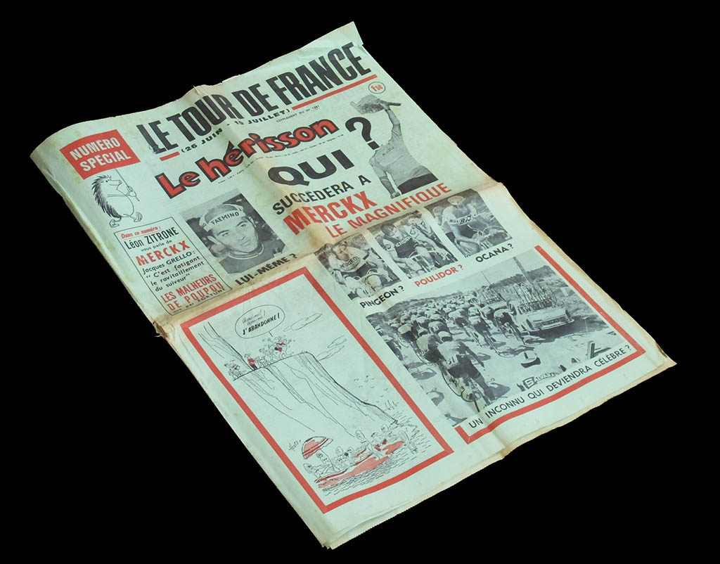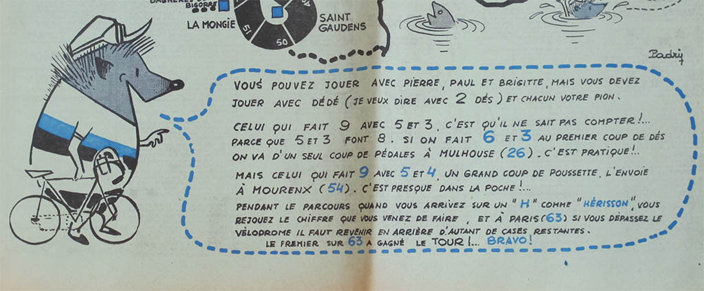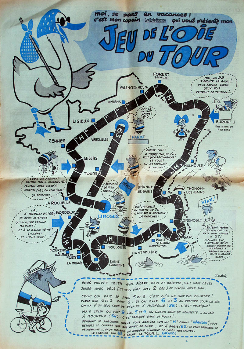 This game was included in a Tour de France special issue of the weekly humour magazine Le Hérisson in 1970. Le Herisson ("The Hedgehog") was founded in 1936 and lasted, with different changes in format and even in name, until 1997. In 2015 the magazine was revived, though in electronic format only. When this game was published, the magazine was quite big (60 x 42 cm), and it was printed on green paper. Rest assured, there is nothing wrong with your screen's colour calibration. The pictures are actually greenish.